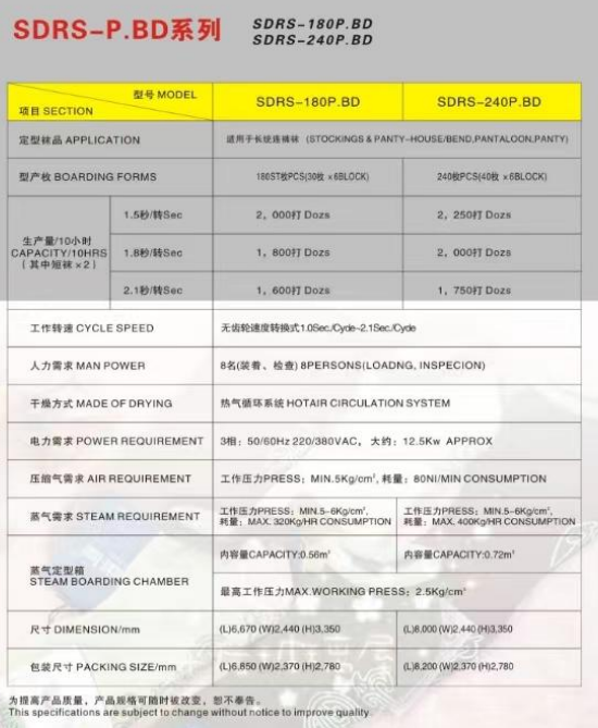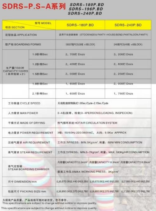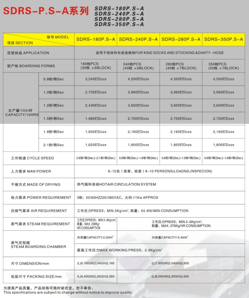 - SDRS‑P.S series auto rotary steam setting machines are designed for all kinds of socks and are available in 150P.S, 180P.S, 240P.S, 280P.S and 350P.S models to match different production scales.