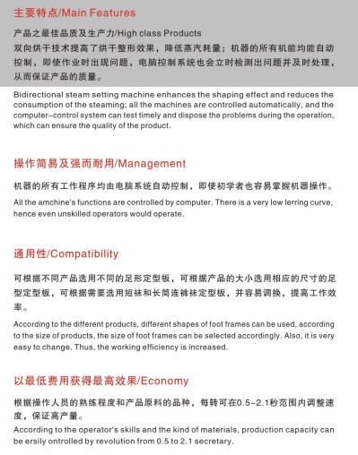 - Bidirectional steam setting improves penetration into the fabric, reduces residual shrinkage and enhances dimensional stability, giving socks a smooth, wrinkle‑free surface and long‑lasting shape.